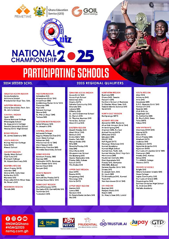 Produced by Primetime Limited in partnership with the Ghana Education Service and GOIL PLC, the 2025 NSMQ is powered by an impressive list of sponsors and partners including Pepsodent, Jupay, and Prudential Life Insurance Ghana.