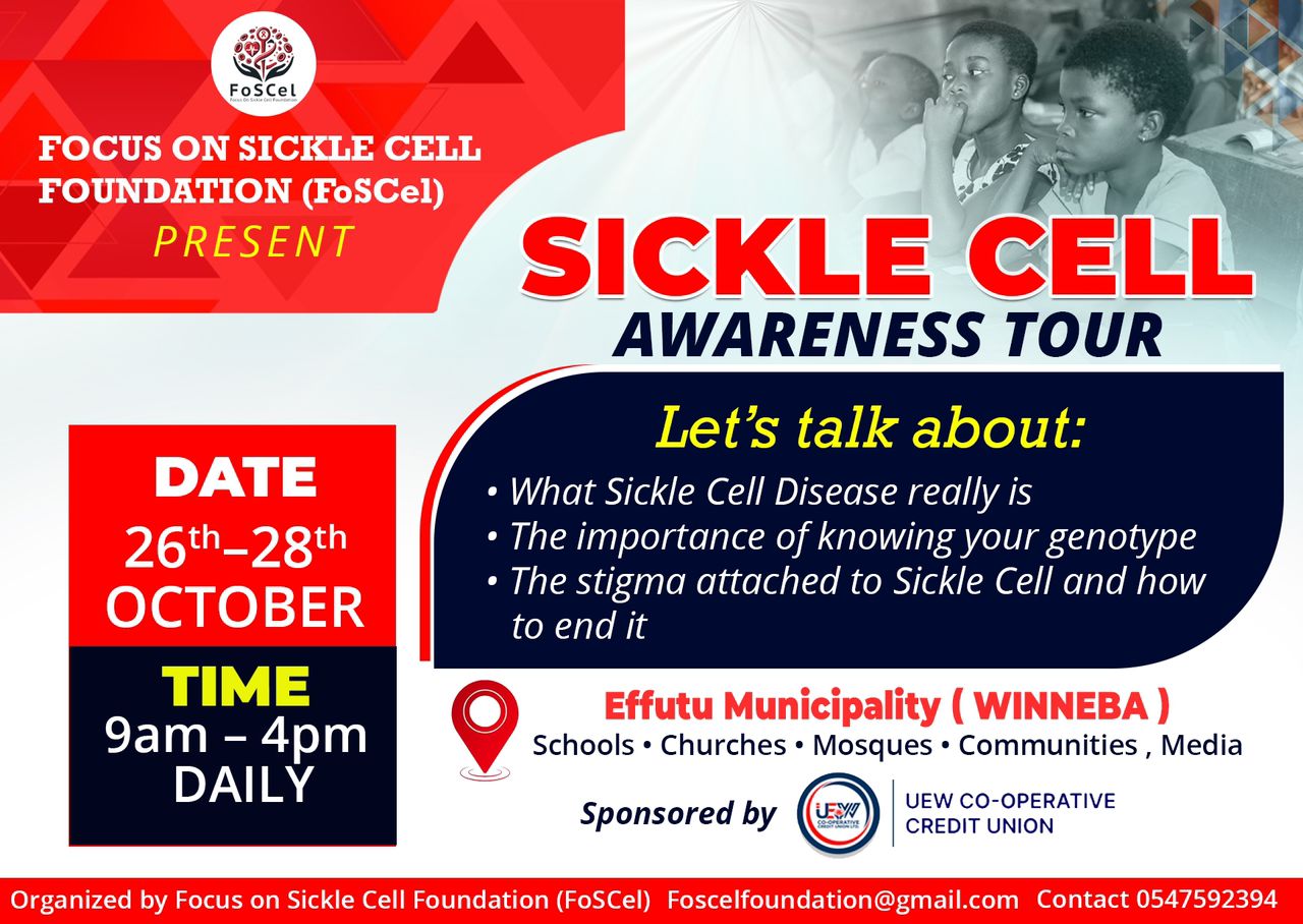 The Focus on Sickle Cell Foundation (FoSCel) has launched a three-day Sickle Cell Awareness Tour in the Effutu Municipality to educate the public on sickle cell disease, its causes, and the importance of genotype testing.