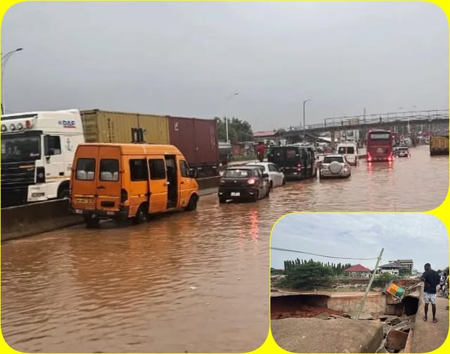 Areas including Kaneshie and Sakumono have been particularly affected, with floodwaters covering streets, blocking major roads, and displacing traders and residents. The rising water has made movement difficult, forcing many people to take shelter until the rain eases.
